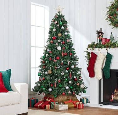 HIGH-QUALITY MATERIALS: Crafted with durable metal hinges and flame-retardant PVC branches that stand tall with the help of a sturdy metal base, so your tree is ready to look its best for the season ahead!; Overall Dimensions: 52"(Dia) x 72"(H) (including stand)