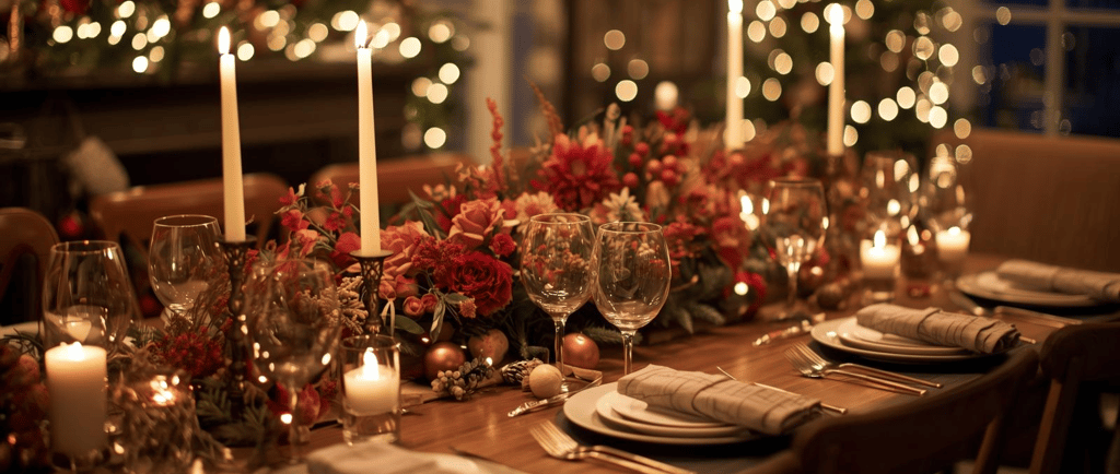 An upscale traditional Christmas dinner setting blends timeless holiday charm with refined elegance, creating a luxurious and festive atmosphere. The table is richly decorated with deep red and emerald green tones, accented by gold-rimmed china, crystal glassware, and polished silver flatware. A grand centerpiece—perhaps a lush garland of evergreens, berries, and gilded ornaments—runs the length of the table, interspersed with tall taper candles in elegant holders that cast a warm, inviting glow. Each place setting is carefully arranged with layered plates, a folded cloth napkin in a jeweled ring, and personalized place cards for a sophisticated touch. The overall effect is both classic and opulent, setting the stage for a memorable holiday feast steeped in tradition and elevated in style.
