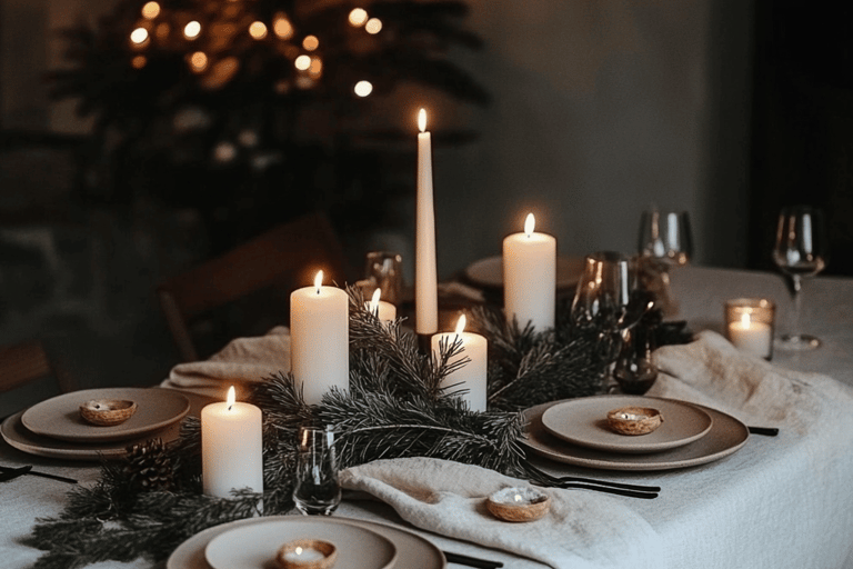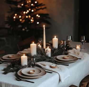 A minimalist Christmas dinner setting embraces simplicity and elegance, creating a calm, inviting atmosphere that highlights the warmth of the season without overwhelming the senses. The table is dressed in a neutral palette—perhaps crisp white linens or soft linen beige—accented with natural elements like pine sprigs, unscented white candles, and simple ceramic dishware. Each place setting is thoughtfully arranged, with minimal yet intentional details such as a handwritten name tag or a single cinnamon stick tied with twine. The overall effect is serene and sophisticated, allowing the focus to remain on meaningful conversation, shared food, and the quiet joy of being together.